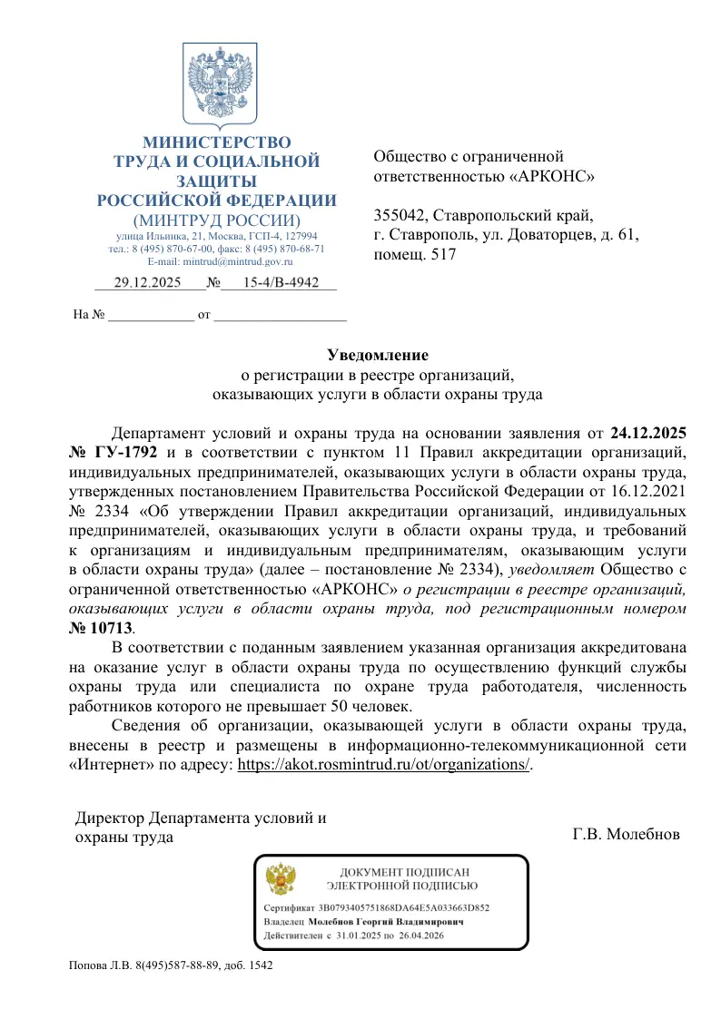 Более 10 лет центр охраны труда "Арконс" обеспечивает полное сопровождение нормативов охраны труда и своевременно информирует клиентов об изменении законодательства. Наша философия заключается в том, что каждая задача, решаемая нашим клиентом, рассматривается нами как личная, и мы стремимся оставаться на одной волне с теми, с кем взаимодействуем.